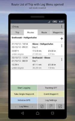 ➤ An editable waypoint-list for each route of your trip lets you create a detailed diary of your complete journey. LD-Log will allow you to enter text or shoot photos in-app as well as import them at a later time. As a sailor, use the sail mode which lets you keep a complete nautical ship's log in an intuitive manner. Many different options are available for convenient storage of trips, routes and journals.