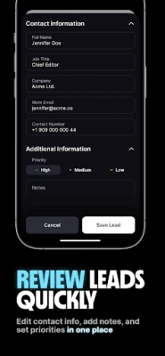 leads at business events. The app lets you scan attendee badges and instantly record their contact details. Built with data protection in mind, it ensures secure handling of attendee information and reliable performance in both online and offline modes. Exhibitors can add notes, set lead priorities, and assign contacts to team members for efficient follow-up. All captured leads are stored in one place for easy access and management. When needed, data can be exported securely to your e-mail for further processing or integration.