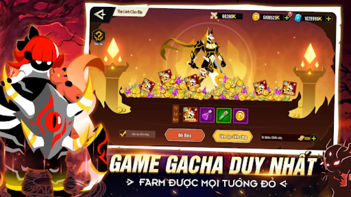 Liên Minh Stickman khai mở với hơn 100+ tướng cực kỳ đa dạng, phong phú. Người chơi chọn 1 Hero yêu thích của mình đã có sẵn làm BOSS, mỗi ngày các nhà thám hiểm sẽ có 10 lượt khiêu chiến free, rớt tài nguyên xịn. Người có thể mua thêm lượt hoặc dùng vé khiêu chiến để gia tăng khả năng farm được các mảnh Tướng Đỏ.