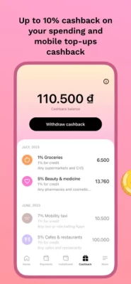 - Pay and get up to 10% cashback on your spending and mobile top-ups cashback.