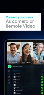 With Live2Social you can capture video from multiple camera angles simply by connecting your iOS devices (iPhone or iPad) - to an third-party platform device on the same wi-fi connection or connect with invitation link as a remote guest no matter the location — and edit it in real time — Key Features: • Internal connection on same Wi-Fi (third-party platforms + iOS remote cameras) • External Guest connection ( iOS cameras )