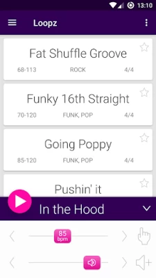 Loopz is a powerful and easy to use drum machine and metronome. It plays drum loops and you can jam along! An intelligently designed drum engine let's you change the speed / BPM of each groove. This makes practicing even more fun.