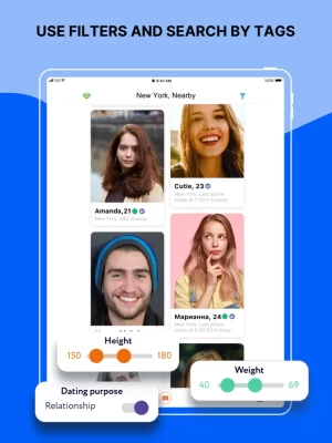 • You can search for your partner by different criteria: age, height, weight, relationship goals, and location. It’s easy, fast and free!