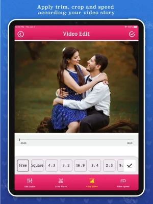 Now make awesome valentine video or love video in just few steps. Just select photos from camera or gallery, apply style, time, background for animation and output mode for video and export video. After creating video or choosing video from camera or gallery, remove unwanted part of video with trim function, get new video orientation with crop function, add some good romantic music, adjust your video speed and finally add some love or love frames, sticker and filter over video and export video. It is easy to save and share video in social media directly from app.
