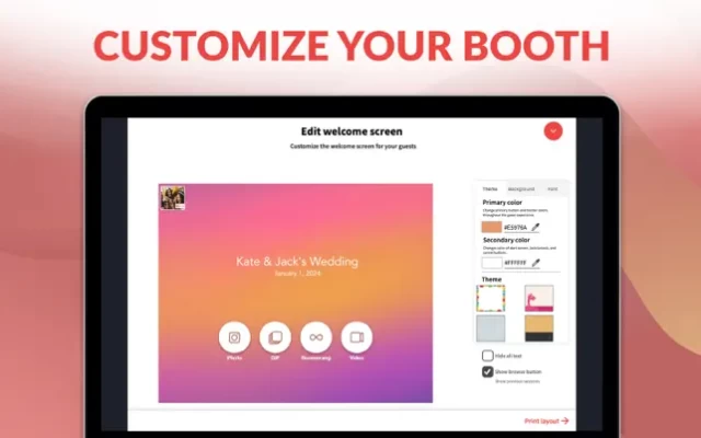 • Fully customize the start screen with beautiful built-in themes, and allow your guests to share using e-mail, SMS, Airdrop, QR code, WhatsApp, and Instagram whether online of offline.