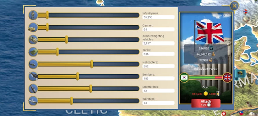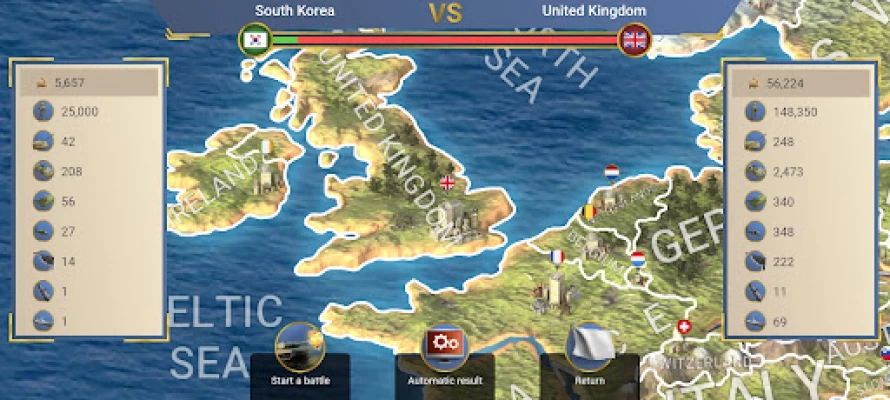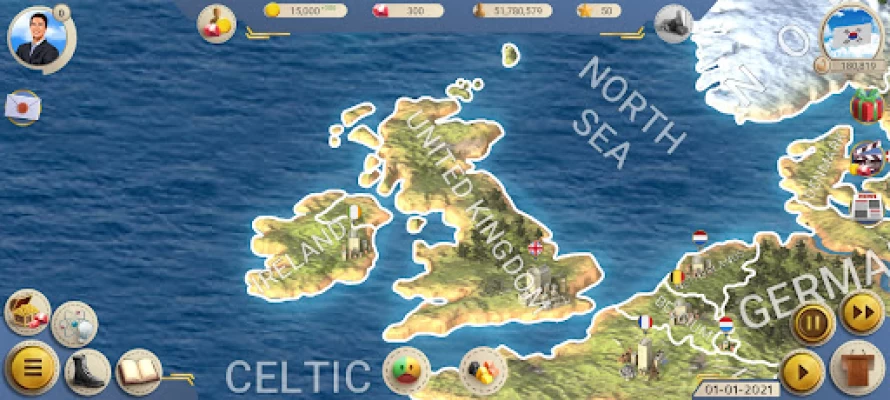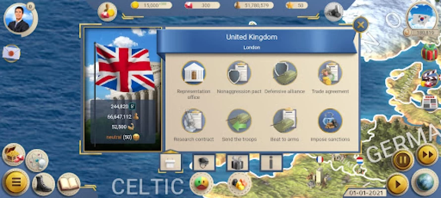 Annex states and kingdoms, carry on war to seize resources and strengthen your power. Build a fleet, train an army, produce military equipment. Build airfields, arsenals, barracks and shipyards. Send spies and saboteurs on missions. Hold your enemies with nuclear weapons. Negotiate with separatists.