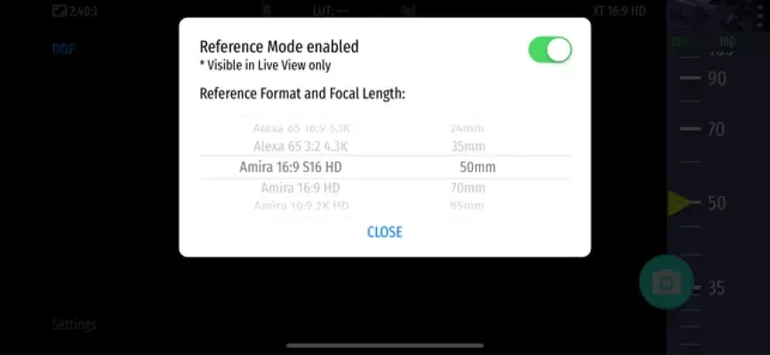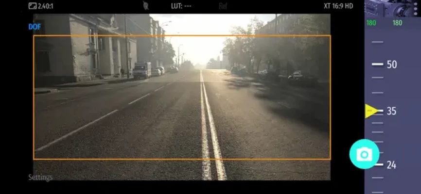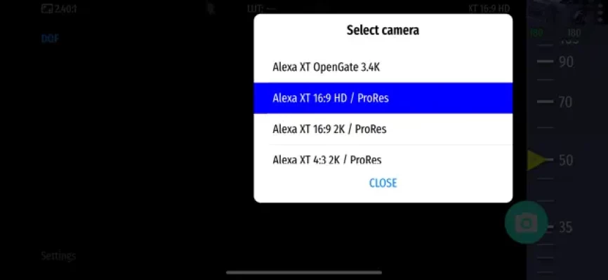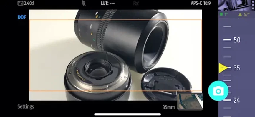 The app is a digital directors viewfinder -- it helps you see the exact field of view for your future shot. Select the camera from the menu and rotate the wheel to select the focal length of the lens.