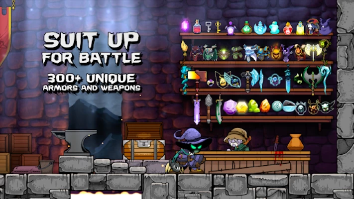 Venture into castles, swamps and forests to fight powerful monsters, giant spiders, dragons, bats, zombies, ghosts, and tough bosses! Choose your class, dress your armor and grab your best weapon among knives, hammers, magical staves, and much more! Find out what happened to the King and uncover the fate of the kingdom!