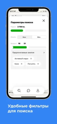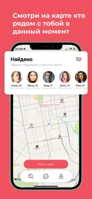 Смотрите на карте кто сейчас рядом с вами, а при помощи доступных фильтров находите именно тех, с кем вы хотите встретится именно сейчас. Доступен поиск по предпочтительным занятиям, например, вы хотите пойти в кино, вы можете выстроить поиск так, что бы найти всех в радиусе от 100 до 10 км, кто в данный момент ищет тоже, с кем пойти в кино!