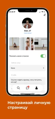 Настраиваете свою личную страницу, загружайте основную фотографию и три дополнительных, размещайте информацию о себе, добавляйте свои интересы, а главное, вы можете выбрать то, чем бы хотели заняться прямо сейчас, именно по нему вас могут найти те, кто бы хотел сейчас заняться тем же самым!