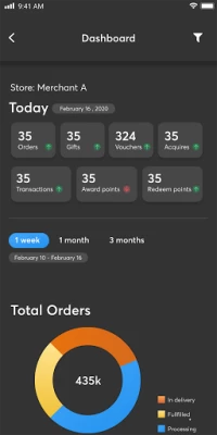 - Thống kê chi tiết, báo cáo trực quan và dễ dàng theo dõi các đơn hàng của Merchant App
