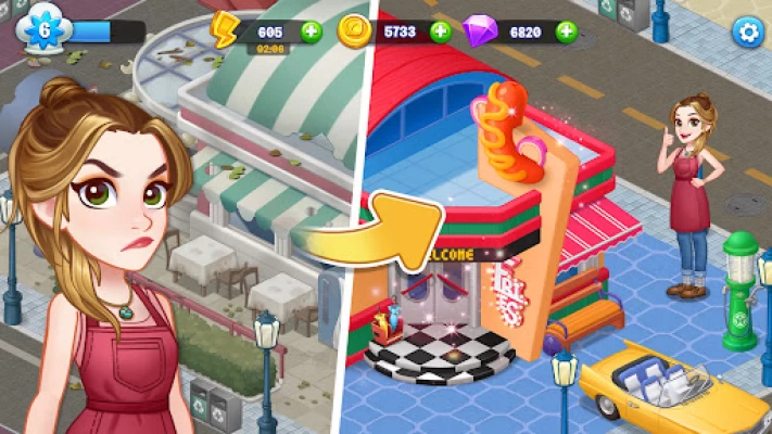 Trang trí nhà hàng của bạn - kết hợp đồ ăn, phục vụ khách hàng của bạn và bạn có thể kiếm được tiền! Hãy cùng nhau cải tạo một căn phòng cũ, bạn có thể lựa chọn nhiều món đồ nội thất cho căn phòng của mình. Trang trí các phong cách phòng khác nhau và trải nghiệm những món ăn ngon khác nhau!