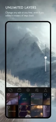 Stack a virtually unlimited number of layers for beautiful blending effects. You can change any edit you do at any time. Change the texture, blend mode, or rotation of a layer even if you added it 30 steps ago. Tweak each adjustment setting anytime during your editing process.