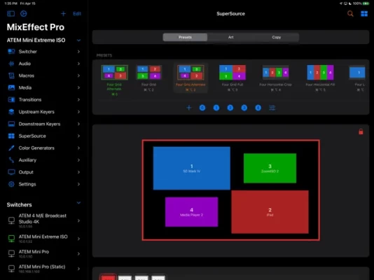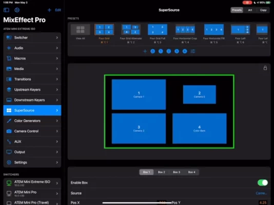 Become a SuperSource master on your ATEM Mini Extreme and Mini Extreme ISO. Automatically animate transitions when switching between SuperSource layouts! Use drag and drop to rearrange your boxes. Save your favorite preset layouts and share them with others.
