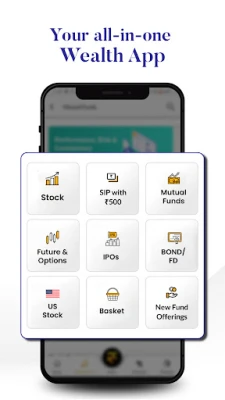You can invest in mutual funds, buy stocks, trade US shares, explore futures & options, apply for IPOs, and build wealth through ETF investments.