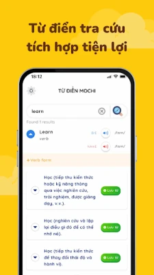 - Từ điển Mochi (Tab Dictionary): Mochi Listening tích hợp sẵn tính năng từ điển. Bạn có thể nhanh chóng tra cứu từ vựng với đầy đủ thông tin: loại từ, phiên âm, audio, ý nghĩa, ví dụ,...