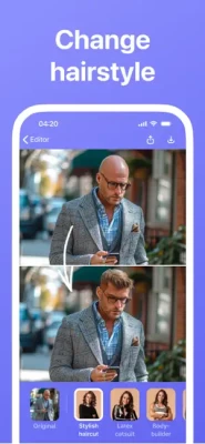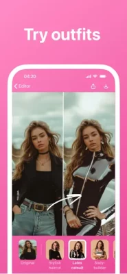 Have fun with cool filters. Try different styles: business look, a superman, an athlete, wearing a latex catsuit and many more. Import your photo, tap on any filter in Outfits. Tap more to get variations.