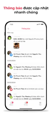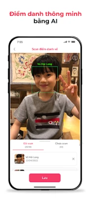 - Điểm danh thông minh bằng AI: Giáo viên điểm danh học sinh bằng tính năng nhận diện khuôn mặt AI. Ngay sau khi trẻ được điểm danh, phụ huynh sẽ nhận được thông báo kèm ảnh check-in của con – minh bạch, an toàn, tiện lợi. Trường hợp cần, giáo viên vẫn có thể điểm danh thủ công bằng cách tick hoặc tải ảnh lên.