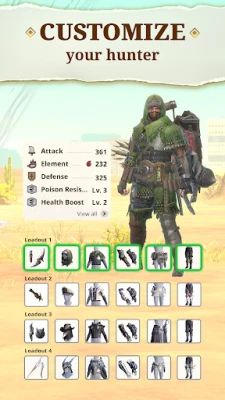 Discover a variety of monsters depending on the habitat around you – Forest, Desert or Swamp – and engage in thrilling hunts solo, or band together with fellow hunters to take on these large monsters. The simplified tap-based controls and high-fidelity graphics enable you to engage in enjoyable hunting action wherever you go.