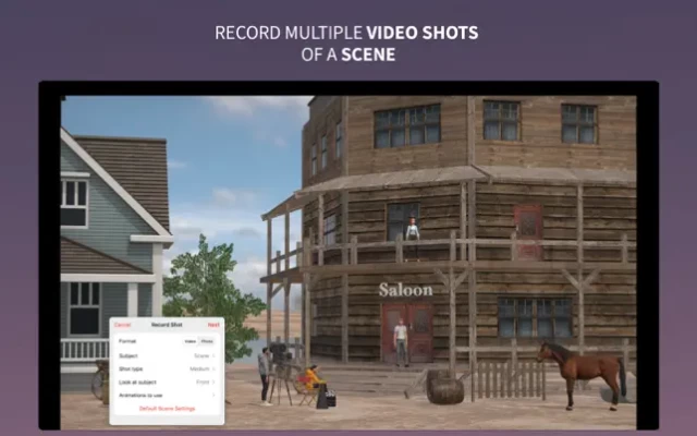 Easily make sharable movies and videos with your Movie Maker 3D scenes. Every 3D scene has a shots list where you can setup and Record a video. Simply tap Record to set up and record your shot. Tap Save if you want to keep it. Tap Cancel if you want to re-record it. All your saved scene videos will be saved to Stories where they will be organized by date.