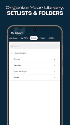 • Organize your sheet music into set lists for quick access