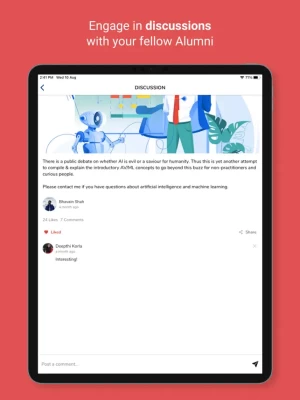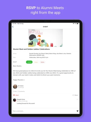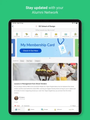You can: - Access news about your alma-mater - Stay updated about events and reunions - Discuss and share updates with fellow alumni - View, post and apply to jobs on your alumni network - Search alumni based on company, location and industry
