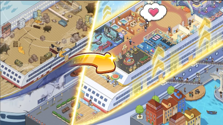 Tại đây, bạn có thể xây dựng và nâng cấp nhiều thứ khác ngoài cabin, các hạng mục giải trí, ăn uống và vui chơi là điều đương nhiên cần thiết! Rạp chiếu phim, nhà hàng, quán nước trái cây và quan trọng nhất là nhà vệ sinh! Một loạt các cơ sở, tất cả tùy thuộc vào sự lựa chọn của bạn! Hãy biến con tàu du lịch siêu lớn của bạn trở thành điểm thu hút khách! Đó là một trung tâm mua sắm giả tưởng trên biển!