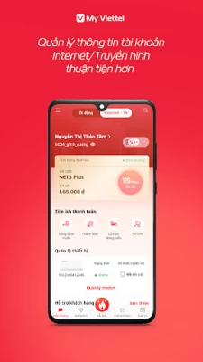 Tra cứu chi tiết thông tin tài khoản, gói cước đang sử dụng: Di động, Internet, Truyền hình... Đăng ký gói cước Data, Thoại, SMS với nhiều lựa chọn và nhanh chóng chỉ với một chạm.