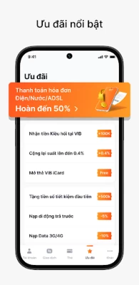 Tận hưởng loạt ưu đãi độc quyền chỉ có trên MyVIB: Hoàn tiền khi thanh toán hóa đơn, nạp tiền điện thoại, data, miễn phí chuyển tiền liên ngân hàng.