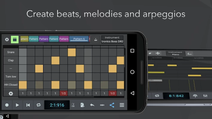 • Create melodies using the internal keyboard with our built-in virtual instruments. You can connect external keyboards too