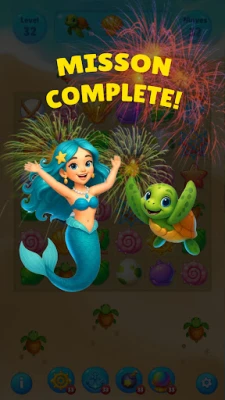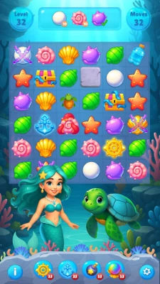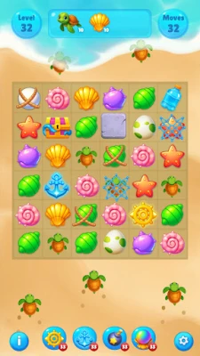 Classic Match-3 Gameplay with New Creativity Ocean Items: Connect items representing underwater life: sparkling shells, starfish, tropical fish, and especially the super-powerful Sea Turtle Gems!