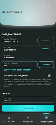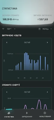 • Детальна аналітика. Переглядайте статистику спожитої електроенергії, витрати та отримуйте звіти про роботу зарядної станції. Зручні графіки і діаграми допоможуть краще розуміти ефективність використання обладнання.