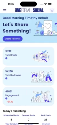 With One For All Social you can post, schedule, review and manage all of your accounts on social media platforms from one place. Gain more followers using our unique features to increase engagement. Save time and money using One For All Social!