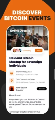 Discover Bitcoin-only events near you and chat with attendees, before, during, and after.