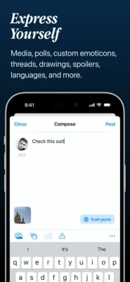 ⁃ Powerful post composer with the ability to add images, videos, GIFs, polls, custom emoticons, drawings, and more