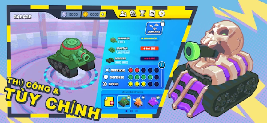 Chọn hình đại diện chú chó và xe tăng yêu thích của bạn để bắt đầu trận chiến. Sử dụng các bộ phận của xe tăng để tùy chỉnh và chế tạo xe tăng của riêng bạn. Mỗi xe tăng bao gồm các bộ phận sau: khung gầm, tháp pháo và thân xe. Sử dụng các bộ phận của xe tăng để bắt đầu chế tạo các bộ phận mới và tăng cấp! Hãy bắt đầu chiến đấu!