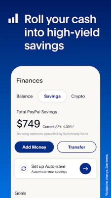 *As of June 07, 2023, the annual percentage yield (APY) for PayPal Savings is 4.30%. This is a variable rate and can change at any time, including after the account is opened. National average source: FDIC National Rates and Rate Caps as of April 15, 2024 https://www.fdic.gov/resources/bankers/national-rates/#one PayPal is a financial technology company, not a bank. Banking service provided by Synchrony Bank, Member FDIC. PayPal Balance account is required to use PayPal Savings