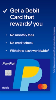 More information and terms available here: paypal.com/us/debitcard ¹ Deals may change and are subject to availability. Eligible items only. Redeem points for cash or other options. Terms and exclusions apply. See PayPal Rewards terms and conditions at PayPal.com/rewards-terms. ²ATMs must display the Mastercard®, Cirrus®, Pulse® or MoneyPass® acceptance marks. Up to $400.00 USD daily withdrawal limit applies. Transactions at non-MoneyPass ATMS have a $2.50 ATM Domestic and International Withdrawal Fee. No fee for MoneyPass ATM Withdrawals in the U.S. Foreign Transaction Fee applies for International ATM Withdrawals. ATM operator fees may also apply. The PayPal Debit Mastercard® is issued by The Bancorp Bank, N.A. (“Bancorp”) pursuant to a license by Mastercard International Incorporated and may be used everywhere Mastercard is accepted. Mastercard and the circles design are registered trademarks of Mastercard International Incorporated. Bancorp is issuer of the Card only and not responsible for the associated accounts or other products, services, or offers from PayPal