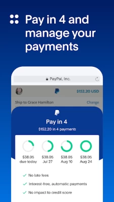 • Payments are easy to manage in the app. Pay in 4 is available upon approval for purchases of $30 - $1500 and is currently not available to residents of MO or NV. 18 years old or older to apply. PayPal, Inc.: Loans to CA residents are made or arranged pursuant to a CA Financing Law License. GA Installment Lender Licensee, NMLS #910457. RI Small Loan Lender Licensee. NM residents: Go to paypal.com/us/webapps/mpp/campaigns/newmexicodisclosure. Learn more atpaypal.com/payin4