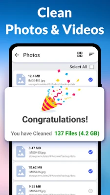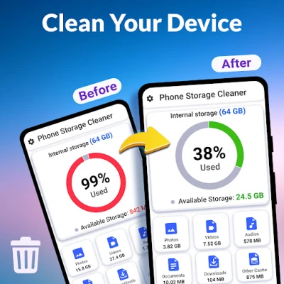 Having trouble clearing up space on your device? Phone Storage Cleaner helps you review and delete unwanted files. This app allows you to scan your photos, videos, documents, and downloads, enabling you to select and delete them.