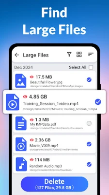 Phone Storage Cleaner helps users identify large files that take up more space. The app finds and displays a list of the large files, allowing users to review them and decide what to keep or delete.