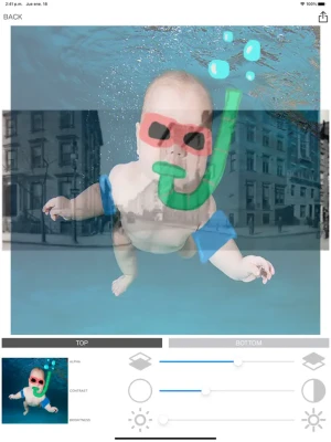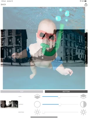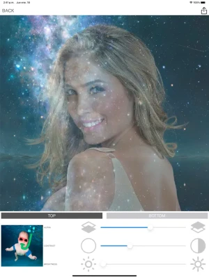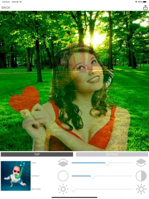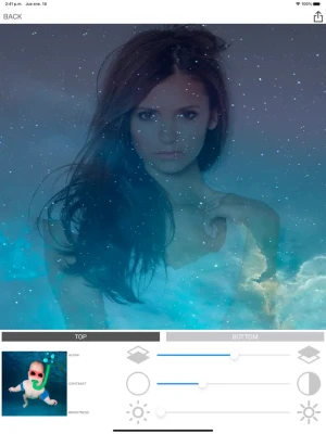 Then you will go to the editing screen where you can change the transparency percentage of the photo above, to mix it with the image below.