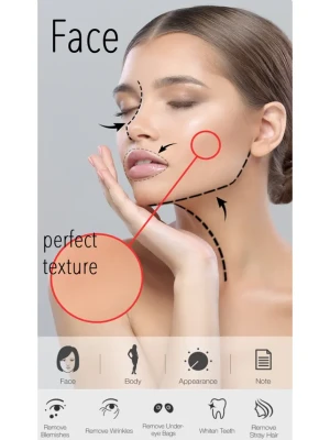 Face: Remove wrinkles, blemishes, red-eye, under-eye bags, and more.