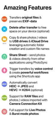 ** Cross-platform solution with native apps for mobile devices, Windows & Mac. Also works on Linux** Reliable and secure software – operating 12 years in the market and continuously updated** No limitations – transfer and backup an unlimited number of photos & videos. Full resolution transfer with HEIC and RAW support; all metadata (EXIF, GPS) is preserved** Flexible: Automatically organise files into folders by recording date, media type, album name and metadata on target device. Customisable file names** Be totally independent of the cloud and iTunes** Managed App Configuration over MDM or using a settings file (config.photosync-app.com)