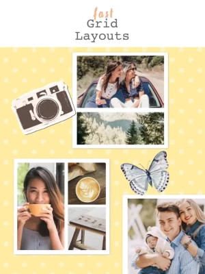 Create a photo collage in seconds with our grid feature. Choose from a wide variety of grid layouts and pre-designed cards or use freestyle mode to create a photo collage in your own, unique style!