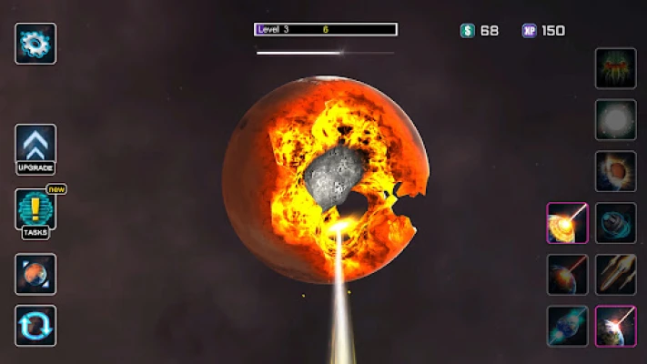 1. On the right side click the icon to select category and the weapon, tap on the planet to use it.