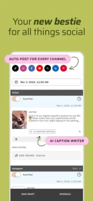 - Auto-post to every social channel in a single view - including TikTok, LinkedIn, Instagram, YouTube, Facebook, X & Pinterest