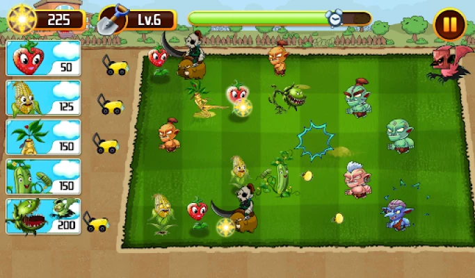 One fine morning, an immense tremor shook the grounds of the Garden Kingdom. The sky turned gloomy. The plants saw a rising tsunami and off came a Goblin Cyclop, pulverizing everything in its way. The war was declared, sirens aloud, the green warriors ready to protect. The Goblin army was something unseen before, covering every inch of sky, land, and water, with the goblin flying bombers, archers, warriors, and goblin riders. The flying goblin was back with the dynamite, which could kill all the plants within seconds. Nonetheless, the sons of the Garden Kingdom, with chlorophyll running in their veins fought with all their might, entangling and the goblins, the pumpkin cannonballs crushed the flying goblins, joined by ginseng, corn, and carnivorous plants in the onslaught. Planting strawberries helped increment the plant power yet remained the question of the dynamite.