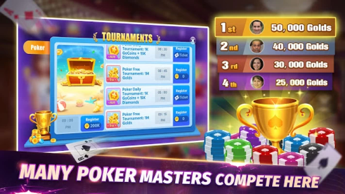 Countless game items:Golds/Diamonds/GoCoins giveaway every day. Come and get your daily rewards, don’t miss it! Besides, you can also win big prizes on the table or in tournaments too!