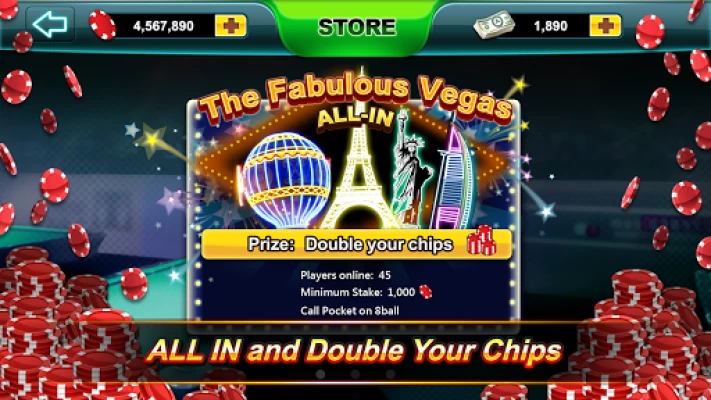 - Free to play! Login every day for free chips, treasure chests and other rewards including cues!